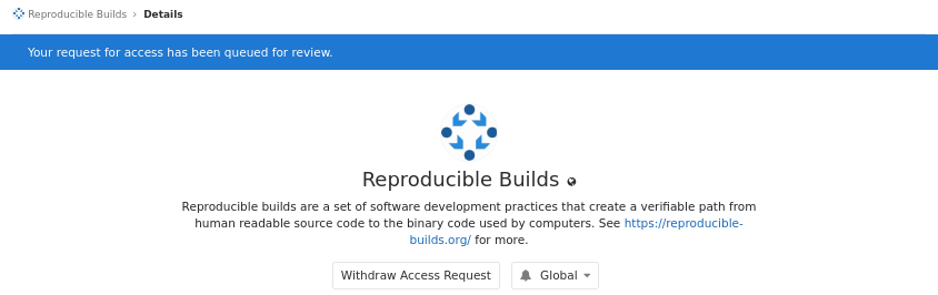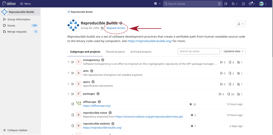 To join the Reproducible Builds group, ensure you are logged into Salsa, visit salsa.debian.org/reproducible-builds and then select Request Access: