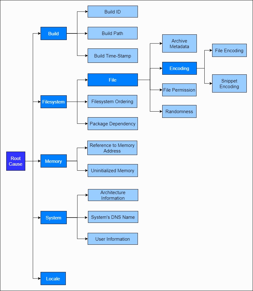 Things will work better if such variations are discovered before users are confronted with unreproducible binaries. Setting up a test protocol in which rebuilds are performed under variations in the environment (aspects like time, username, CPU, system version, filesystems, amongst many others) will greatly help. A recent empirical study identifies 16 variations in the environment, as demonstrated in the taxonomy below.