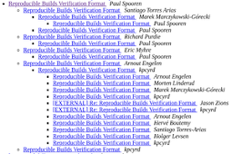 Paul Spooren started a thread titled Reproducible Builds Verification Format which reopens the discussion around a schema for sharing the results from distributed rebuilders: