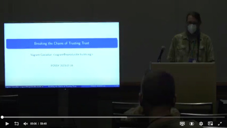 The episode is available to listen (or download) from the Sustain podcast website. As it happens, the episode was recorded at FOSSY 2023, and the video of Vagrant’s talk from this conference (Breaking the Chains of Trusting Trust is now available on Archive.org: